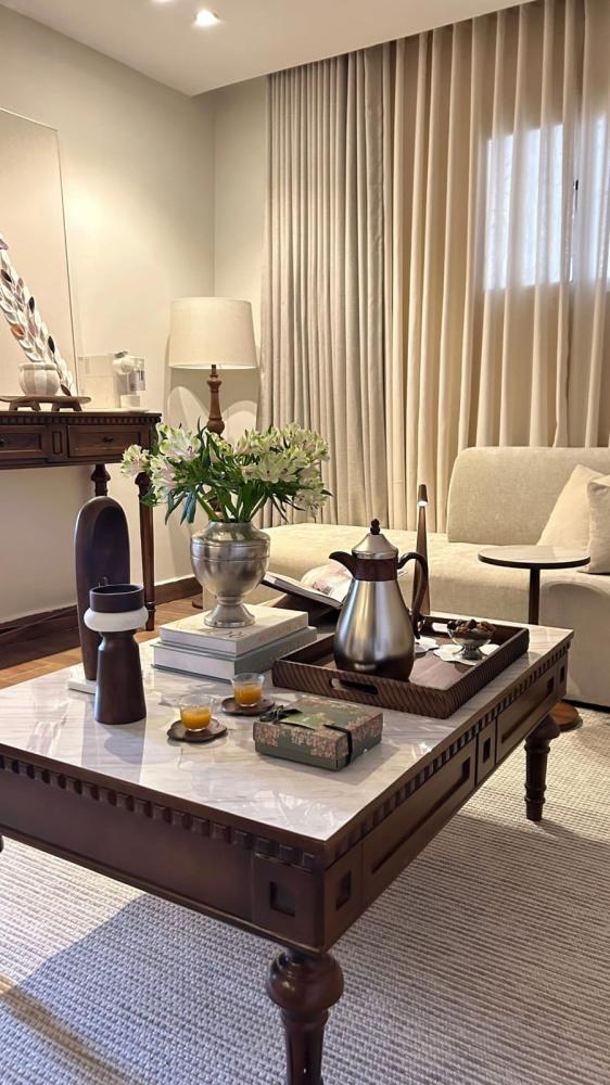 طاولة قهوة راقية تجمع بين جمال السطح الرخامي الأملس والإطار الخشبي المتين بلون دافئ يمنح الصالة فخامة ودفئًا في آنٍ واحد.